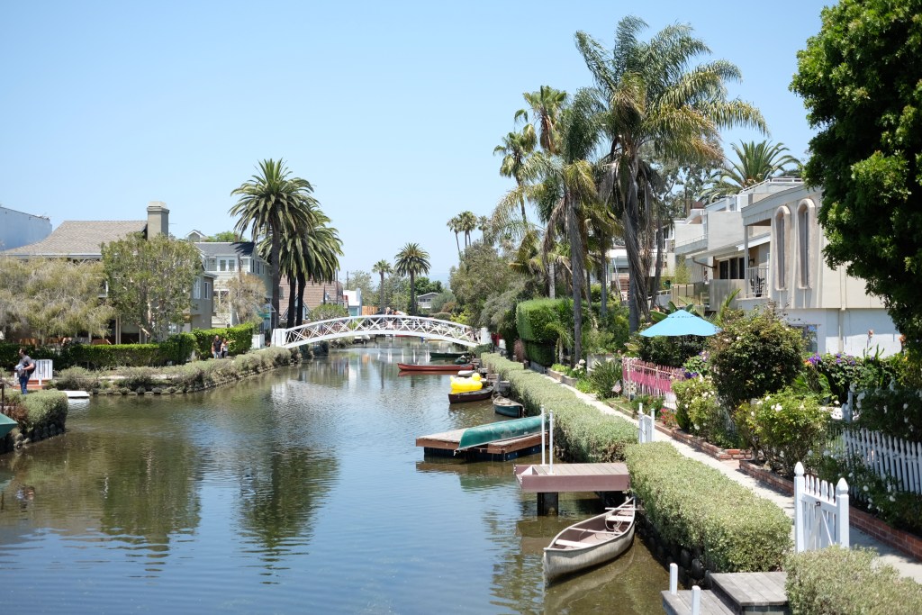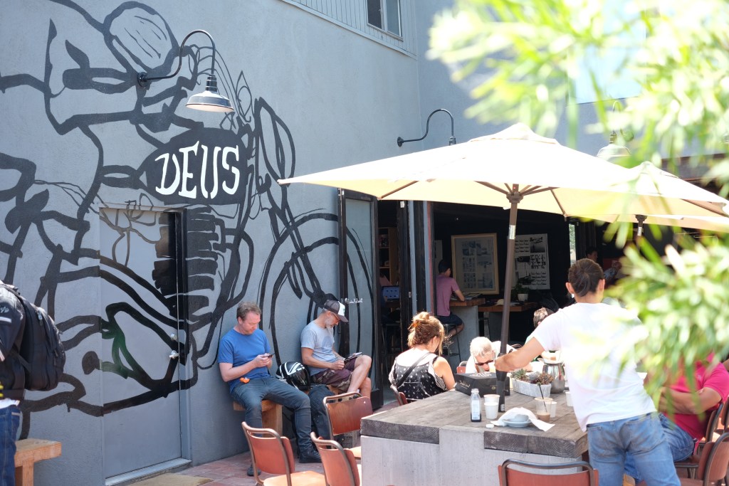 On commence la journée par un petit déjeuner chez Deus Ex-Machina, café et avocado toast sur la terrasse ensoleillée, entre deux motos « custom » et quelques planches de surf pour la déco. Difficile de faire plus Californien. Ensuite, on roule jusqu’à la Venise de Los Angeles : Venice Canals.